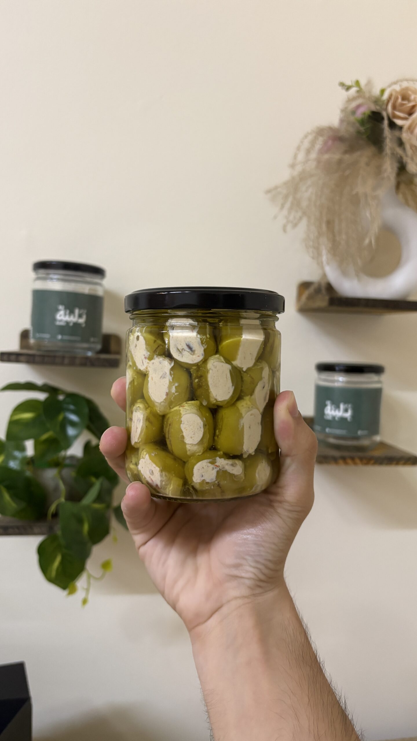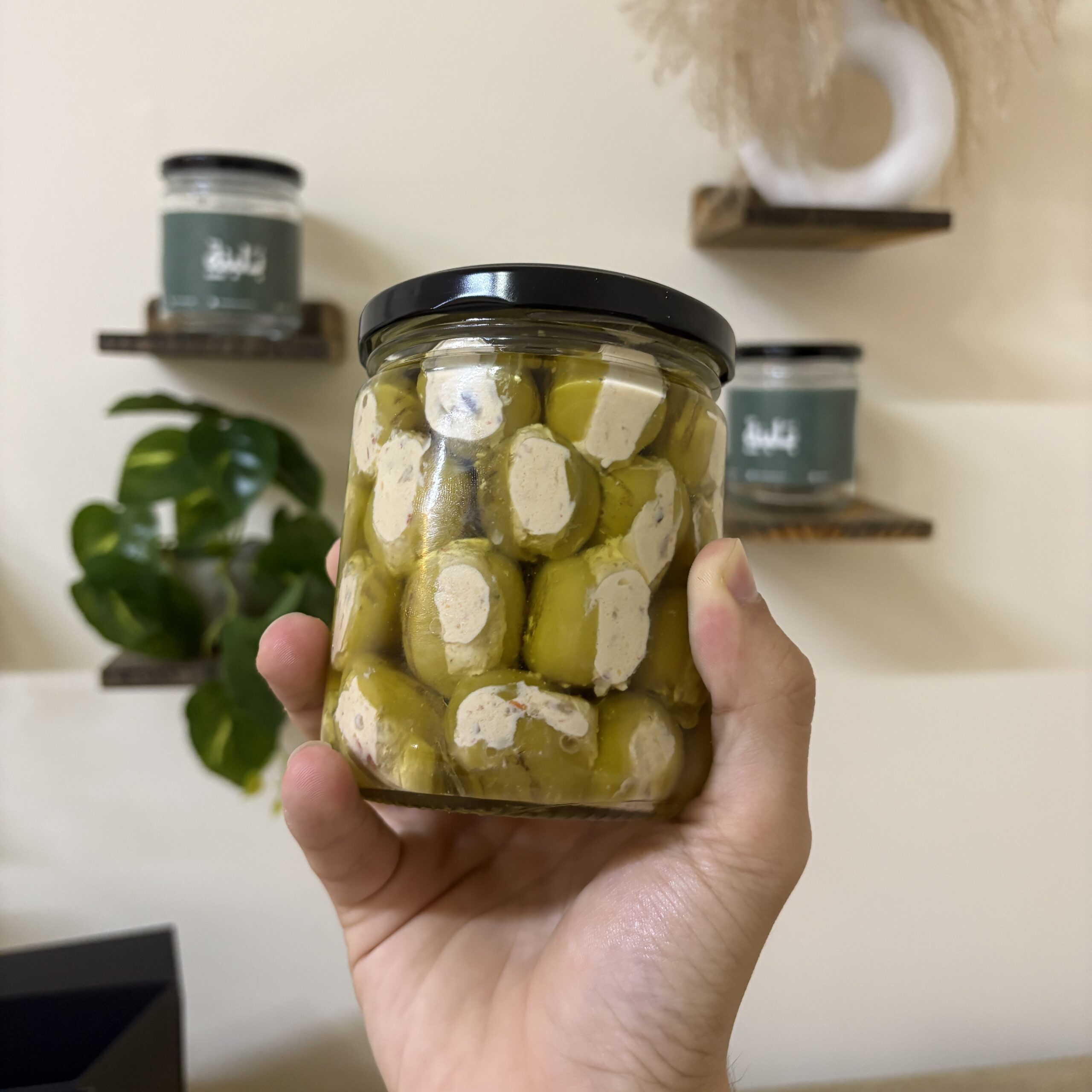 زيتون مشوي طازج، محشي بخلطة لبنة المكدوس